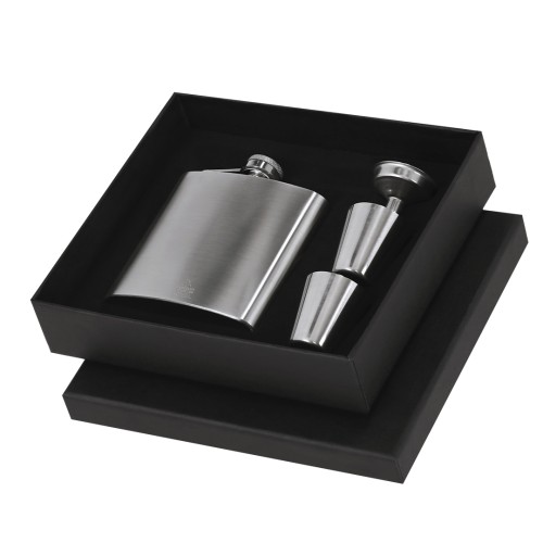 Set de Petaca con Accesorios en Acero Inoxidable Reciclado. Incluye:- Petaca de 175 ml con sistema antigoteo y cierre de rosca para un almacenamiento seguro y sin derrames.- Dos vasos medidores de 30 ml de capacidad.- Embudo de dosificación, que facilita el llenado.Incluye distintivo de Acero Inox Reciclado. Prresentado en caja negra.El acero es uno de los materiales más demandados y que puede encontrarse casi en todas partes, desde productos de uso diario a grandes construcciones. Con innumerables propiedades, entre las que cabe destacar la durabilidad y su alto grado de reutilización, convirtiéndolo en una alternativa muy valorada en soluciones de sostenibilidad. Debidamente tratado, permite obtener nuevos recursos de infinita utilización.