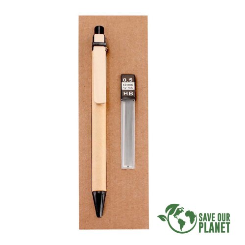 Set Portaminas Ecológico en base cartón reciclado. Incluye recambio 12 minas de 0.5mm.