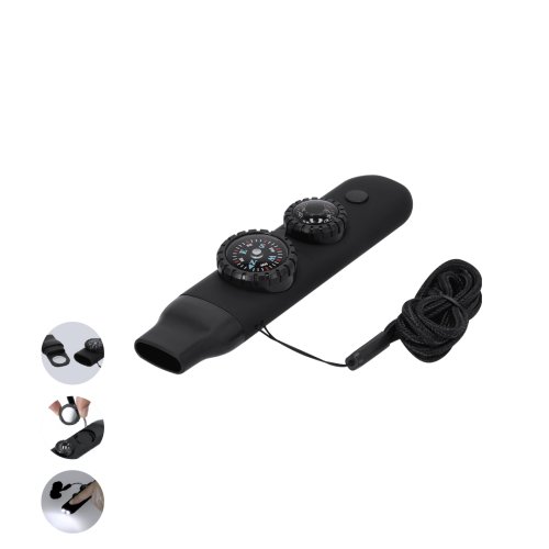 Silbato de supervivencia fabricado en resistente ABS con acabado gomoso. Integra 6 funciones esenciales:- Brújula de 2,55 cm de diámetro, con indicaciones de Norte, Sur, Este y Oeste.- Silbato de alta potencia, ideal para emitir señales de emergencia.- Termómetro con rango de temperaturas de -20 ºC a 50 ºC.- Lupa de 2 cm de diámetro, perfecta para observar detalles pequeños o incluso para encender fuego mediante concentración de luz solar.- Espejo, incorporado en la parte inferior de la brújula.- Linterna con 2 LEDs y botón de encendido/apagado en la parte superior.Incluye un práctico cordón para facilitar su transporte, ideal para llevarlo cómodamente colgado al cuello.