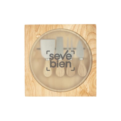 23 x 23 x 2,5 cm. Madera. Tabla para quesos. En la parte interna contiene imán que sostiene 4 utensilios de acero inoxidable y mango de madera. Tabla circular de vidrio templado Ø 20 cm. Presentación en caja de regalo.