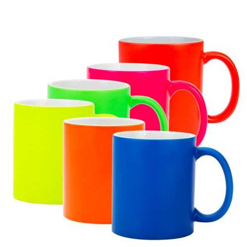 Tazón cerámico de 11oz (330 cc) con superficie exterior de color fluorescente, interior blanco, para Sublimación. Producto de calidad superior ORCA. Presentación en bolsa plástica translúcida + caja de cartón blanco.