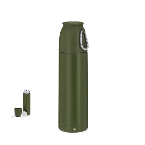 Set de termo con taza fabricado en Acero Inox Reciclado. Termo de 500 ml de capacidad y de doble pared, que garantiza una mejor y más duradera conservación de la temperatura, con dosificador de seguridad. Taza de 120ml, ajustable mediante rosca y con práctico mosquetón de transporte. Termo y taza en acabado mate a juego ideales para disfrutar de la bebida, ya sea caliente o fría, en cualquier momento y lugar. Con distintivo de Acero Inox Reciclado.El acero es uno de los materiales más demandados y que puede encontrarse casi en todas partes, desde productos de uso diario a grandes construcciones. Con innumerables propiedades, entre las que cabe destacar la durabilidad y su alto grado de reutilización, convirtiéndolo en una alternativa muy valorada en soluciones de sostenibilidad. Debidamente tratado, permite obtener nuevos recursos de infinita utilización.