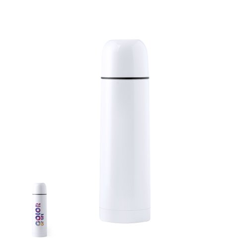 Termo de 500ml de capacidad en resistente acero inox. Superficie exterior especialmente diseñada para marcaje en sublimación. Con tapón de seguridad y presentado en atractiva caja individual de diseño.
