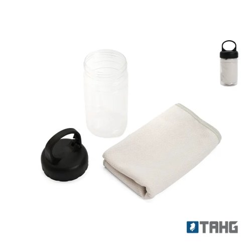 Toalla con estuche portátil. Fabricada en poliéster, PET y polipropileno. Cuenta con toalla de secado rápido (30 × 80 cm) y envase plástico con gancho incorporado para colgar o transportar fácilmente. Es ideal para entrenamientos, actividades al aire libre o viajes, gracias a su tamaño compacto y capacidad de secado rápido.
